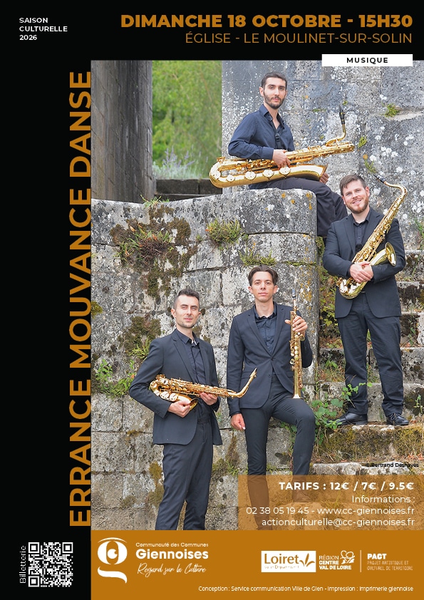 Errance, Mouvance, Danse est un concert au répertoire varié autour du mouvement. C’est avec des oeuvres poétiques et éclectiques que l’ensemble Saxonium propose aux spectateurs de découvrir ou redécouvrir la grande palette de sonorités et d’émotions qu’offre un quatuor de saxophones.